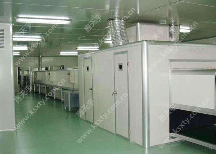 較為優秀的設計是將輻射與傳導對流相結合,即將入口端長度為烘干室總長度的30-40%的一段區域設計為微弱空氣對流的輻射加熱區,其余是對流烘干段。所有烘干室的開口都要有強制的熱空氣氣幕,以阻止熱量的散失及灰塵的進入。其次,熱空氣在進入烘干室之前應有多道過濾系統,以減少塵埃。