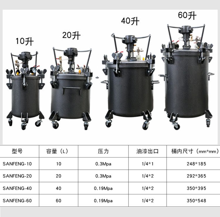 三豐壓力桶具有防腐蝕耐高壓特性。適用于油性涂料、脫模劑、膠水等其它常規液體輸送。